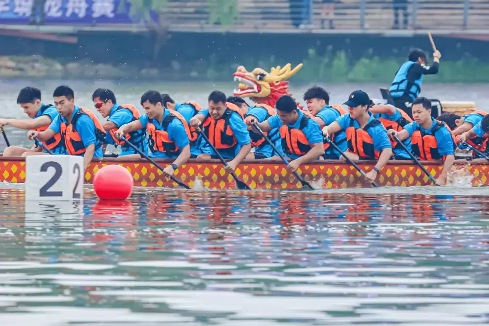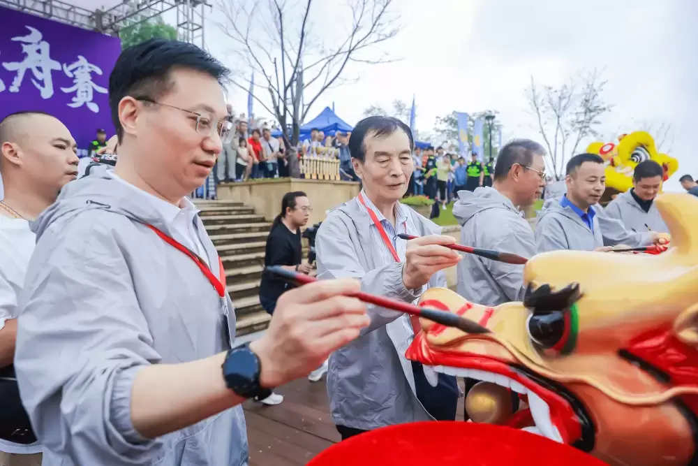 开幕式上,观赛嘉宾用毛笔给龙舟点睛,为选手们送上祝福后,随着开赛锣声响起,龙舟飞驰竞渡,鼓声阵阵,呐喊频频。选手们劈波斩浪,奋勇向前,在百桨翻飞间,水花四溅,泼洒出激昂向上的精气神。
