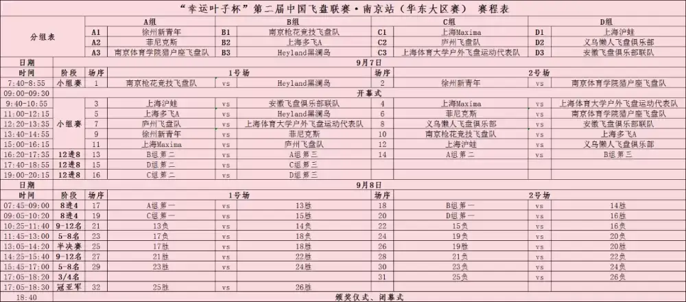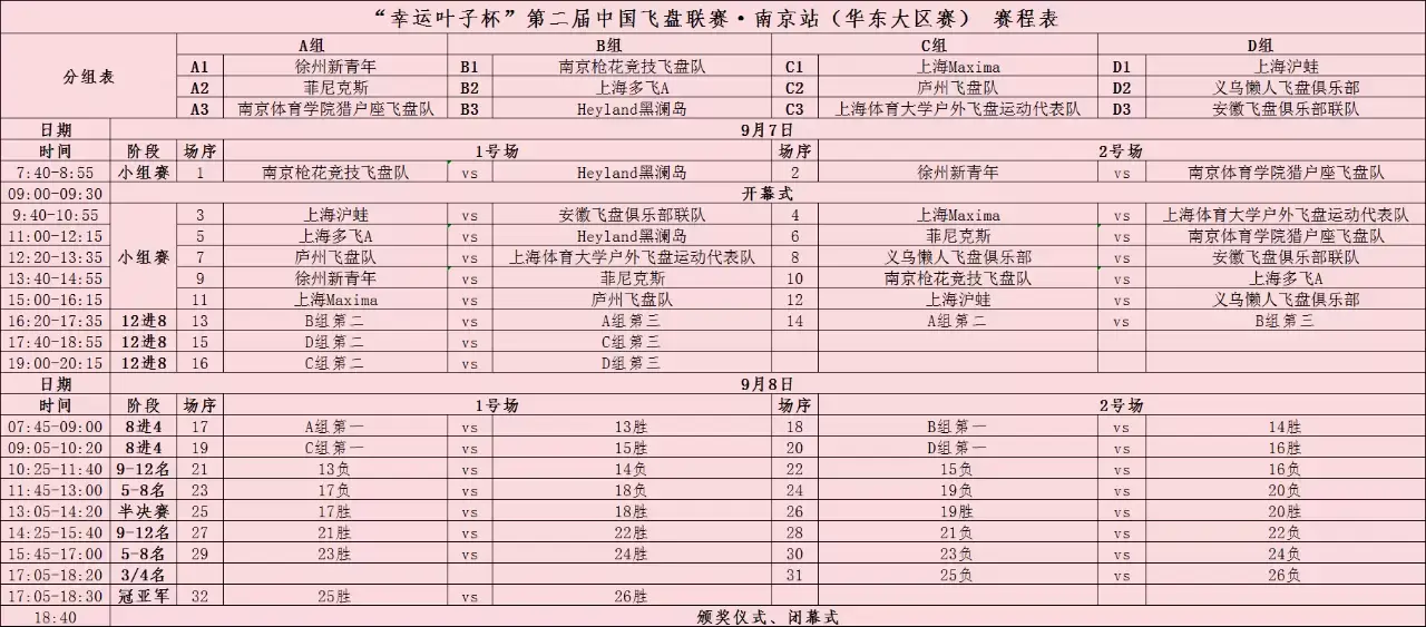 “幸运叶子杯”第二届中国飞盘联赛•南京站(华东大区赛)共有12支队伍参赛,其中江苏4支队伍,上海4支队伍,安徽和浙江各2支队伍。在这些队伍中,不乏实力强劲的队伍,来自上海的上海沪蛙是2022-2023年中国飞盘联赛的冠军队伍,南京枪花竞技飞盘队、徐州新青年飞盘队、南体猎户座飞盘队则在2022-2023年中国飞盘联赛·江苏南京站比赛中分获了冠、亚、季军。南京体育学院猎户座飞盘队、上海体育大学户外飞盘运动代表队,也将代表南京、上海两地高校在比赛中展现青春风采。本次参赛的运动员有00后,90后也有80后,他们中既有飞盘新生力量,也有资深玩家;既有高校学子,也有俱乐部职业飞盘手,他们来自不同职业背景,因为对飞盘运动的热爱把他们凝聚在一起,他们将通过2天32场比赛角逐出冠、亚、季军。