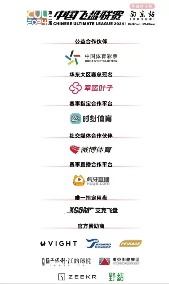 2024-09-8 9 0247日上午,“幸运叶子杯”第二届中国飞盘联赛•南京站(华东大区赛)比赛,在南京乐创汇体育场开赛。本次大赛由国家体育总局社会体育指导中心主办,全国飞盘运动推广委员会、江苏省社会体育管理中心、南京体育产业集团、南京江北新区宣传和统战部承办,江苏省飞盘运动推广委员会协办,杭州飞盘文化发展有限公司、南京紫金体育产业股份有限公司运营,亚洲运动用品与时尚展(ISPO南京站)组委会、江苏天马网络科技集团有限公司支持。