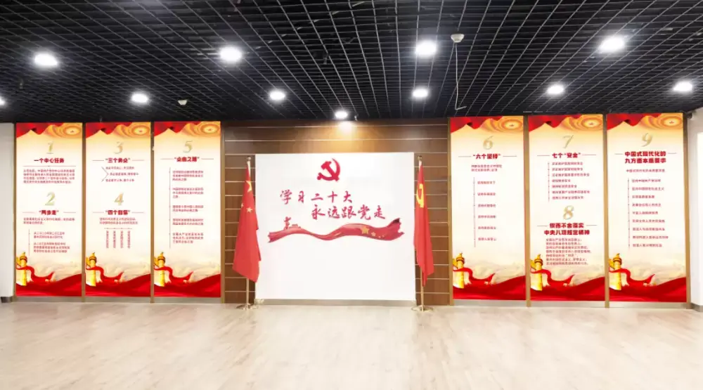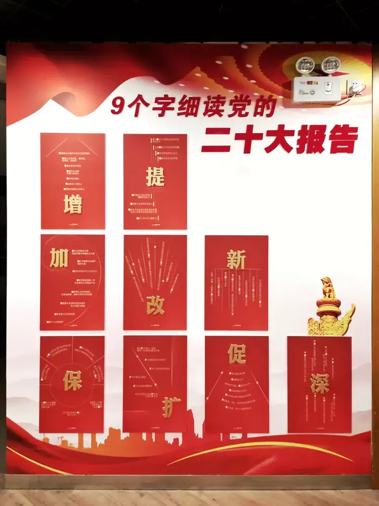 四是建阵地、造氛围,将6楼办公区域之前企业廉政文化基地改造成学习宣传贯彻党的二十大精神的阵地,宣传展板用1到9阿拉伯数字以及“增、提、加、促”等言简意赅的词句高度概括党的二十大报告内容,以及利用宣传橱窗等载体,在企业内部全力营造浓厚学习氛围。