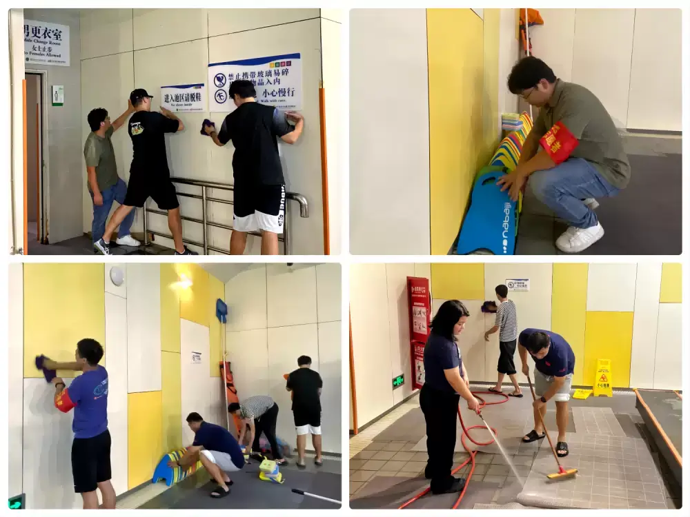 8月29日下午,党员突击队来到雨花外校游泳馆,与现场的场馆员工一起清扫游泳馆卫生,做好游泳馆开馆前的各项准备工作。工作现场,党员志愿者们合理分工,有的冲洗地垫,有的擦拭墙面,有的整理教学工具,有的检查防护用品,医疗用品,每个人都按照流程规定做好每一道工序。经过大家的努力,整个场馆焕然一新,用最好的姿态迎接新学期的到来。
