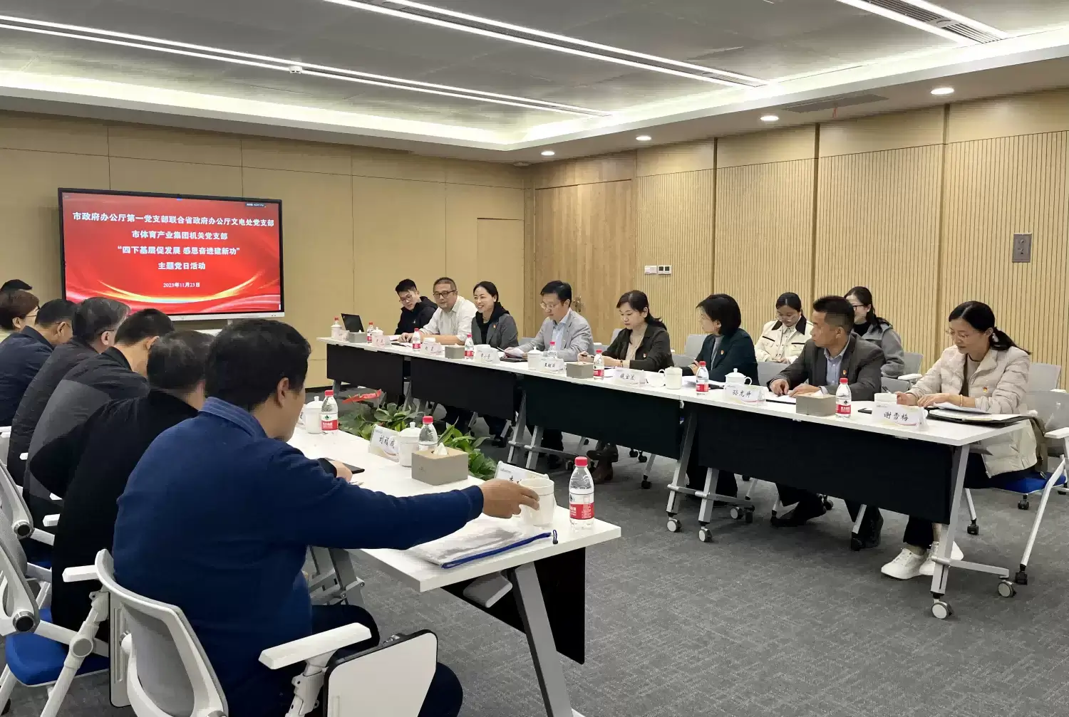 2023-11-27 6 399为进一步巩固和拓展主题教育成果,走好新时代党的群众路线,结合推进党的创新理论学习教育计划,常态化开展“四下基层”工作,11月23日下午,市政府办公厅第一党支部联合省政府办公厅文电处党支部、市体育产业集团机关党支部走进青奥黑馆,开展“四下基层促发展 感恩奋进建新功”主题党日活动。