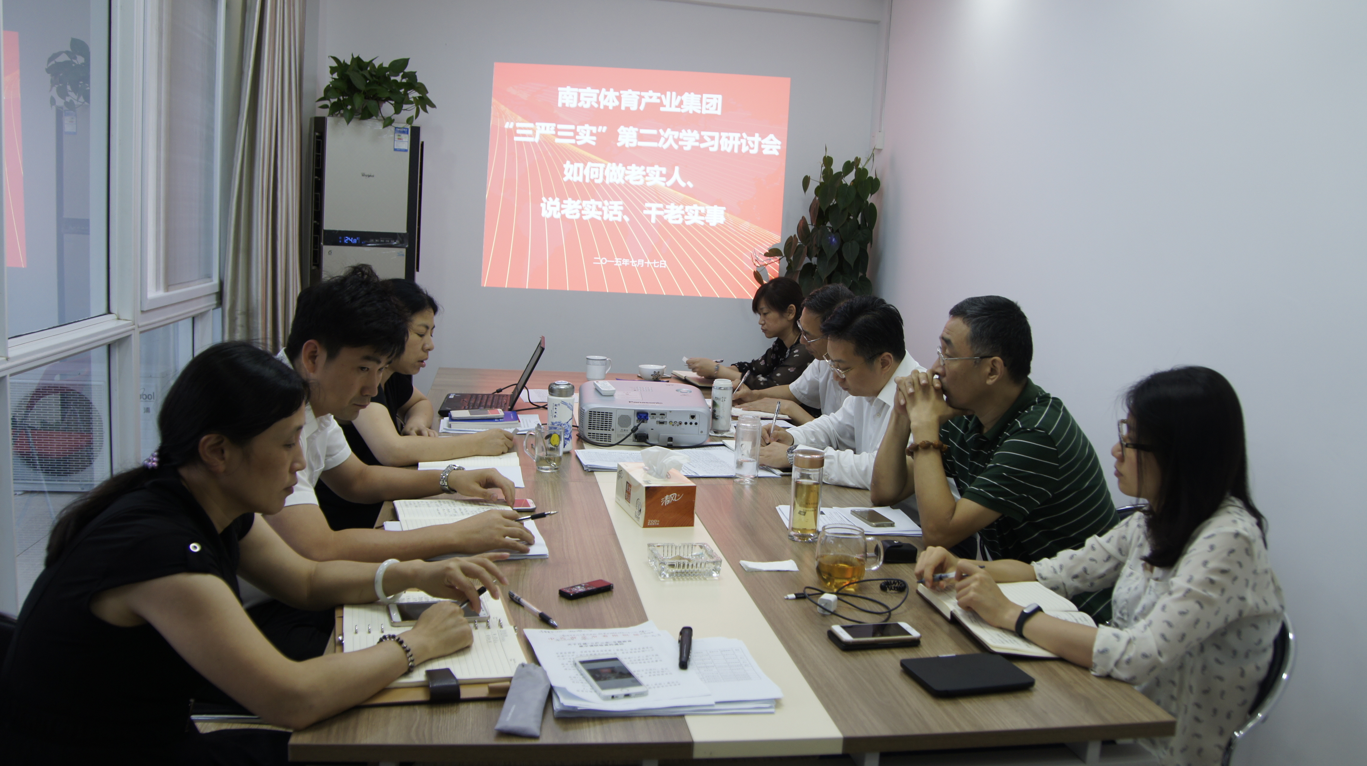 2015-07-18 35 3647月18日下午,南京体育产业集团党委召开会议,按照“如何做老实人、说老实话、干老实事”研讨主题,开展了“三严三实”专题教育第二次学习研讨。集团党委书记、董事长章小奇主持研讨会,集团领导班子成员、各部门负责人参加了会议。