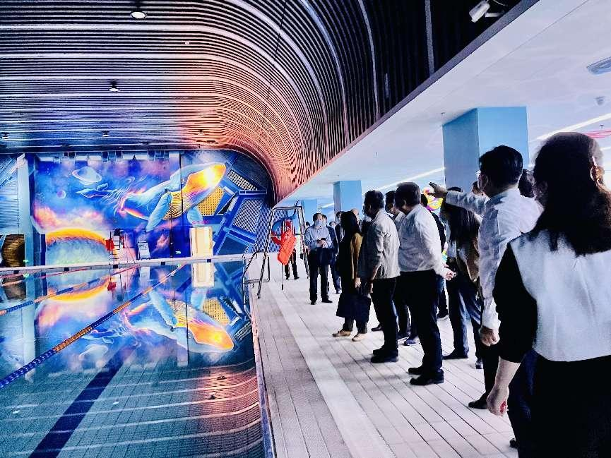 田家炳高级中学人防工程游泳馆拥有标准赛道泳池、小型游泳池、戏水池等多种类型泳池,可以说是一个泳池“综合体”,水域面积近1200平方米。池水通过德国先进水质循环处理器逆流式水处理石英砂循环方式,实现24小时高质量鲜活水。在馆内墙体装饰方面,突破了传统蓝白单色色调,融合裸眼3D技术,结合海洋主题创新打造全市首家以人防体育文化空间为特色的游泳馆。翱翔在深邃太空中的“大蓝鲸”主题3D壁画惊艳了调研组一行。
