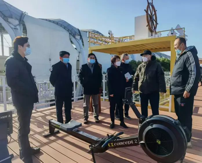 考察团在青奥羊山湖基地三楼露台,现场体验了测功仪。
