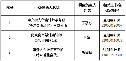 本招标项目南京全民健身有限公司增资扩股审计项目(招标项目编号:066021S23573)经评标委员会评审,确定001 第1包的中标候选人,现公示如下: