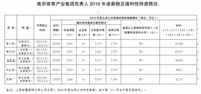 南京体育产业集团负责人2016年度薪酬及福利待遇情况
