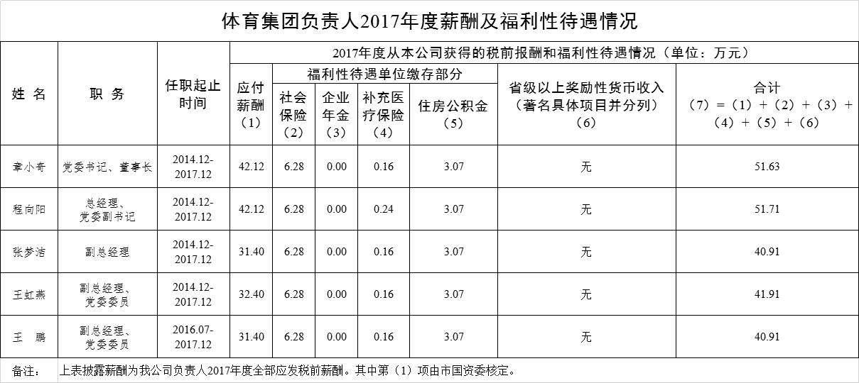 » 体育集团负责人2017年度薪酬及福利性待遇情况
