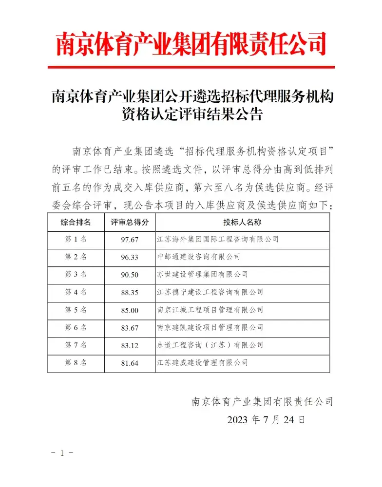 » 南京体育产业集团公开遴选招标代理服务机构资格认定评审结果公告