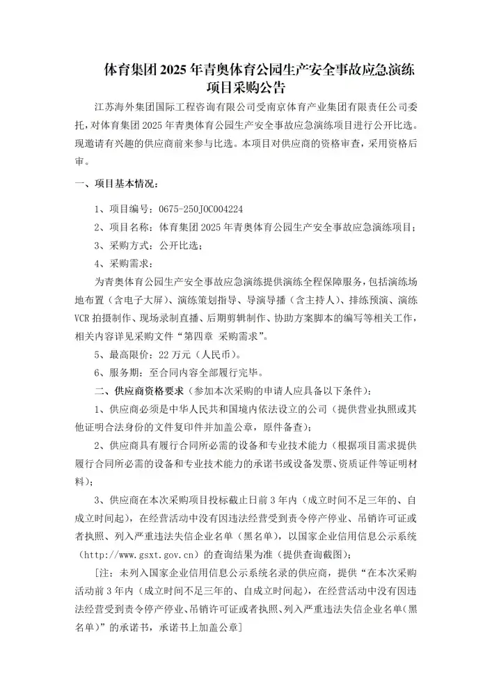 采购公告-体育集团2025年青奥体育公园生产安全事故应急演练项目