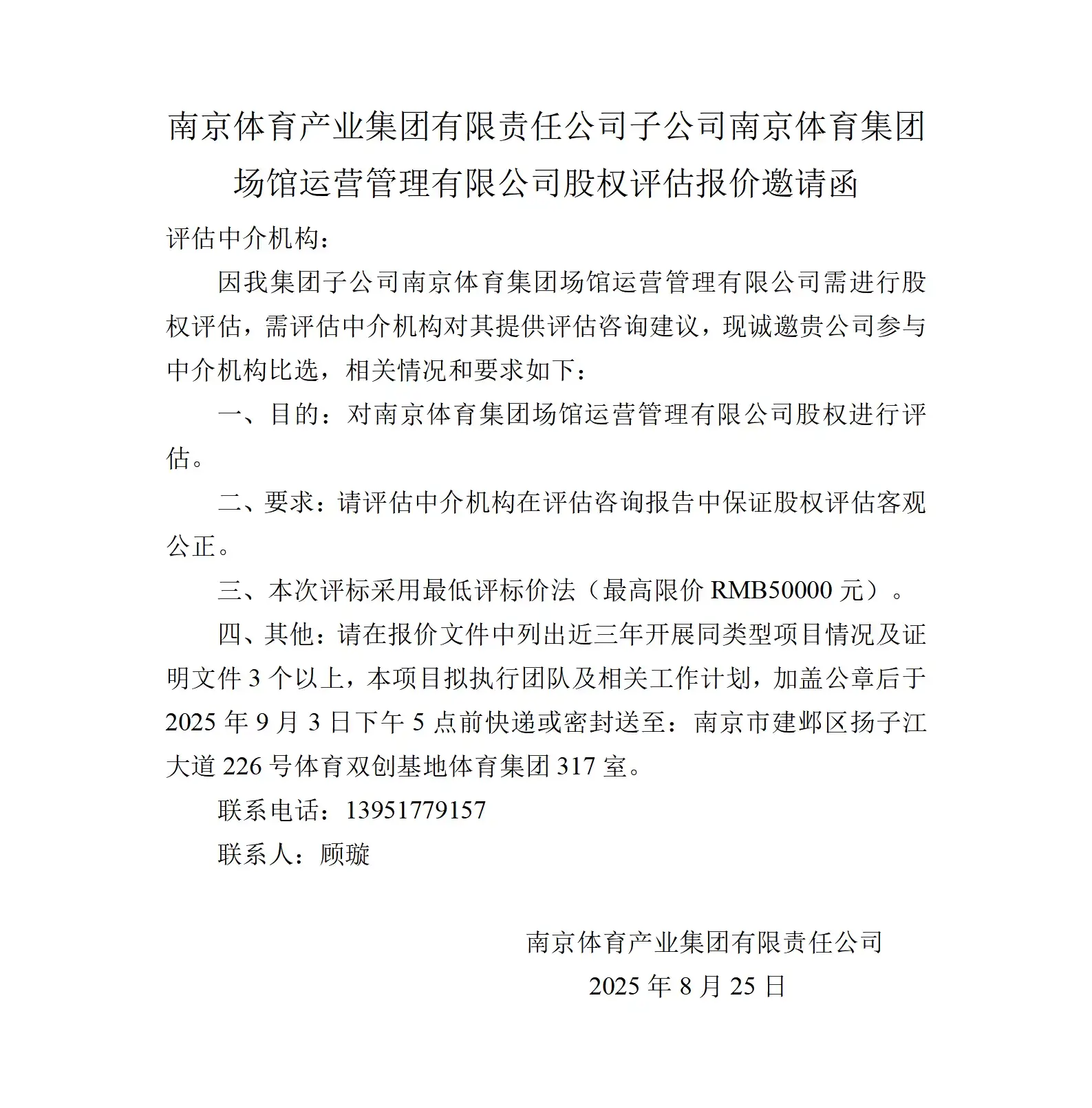 开云手机平台子公司南京体育集团场馆运营管理有限公司股权评估报价邀请函