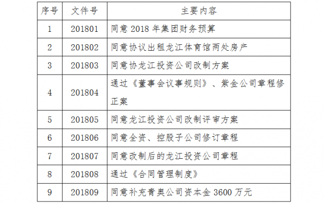 2018年,体育集团共召开董事会3次,讨论并形成董事会决议9项,其中,涉及混合所有制改革3项,同意协议出租房产1项,修订子公司章程1项,审议通过制度2项,追加投资1项,审议通过了2018年财务预算。具体内容如下: