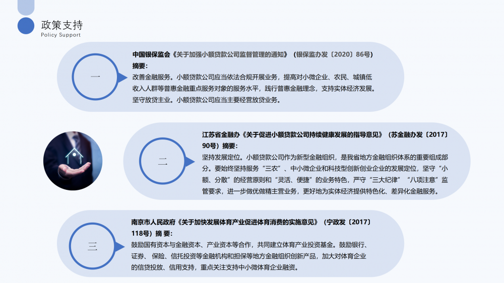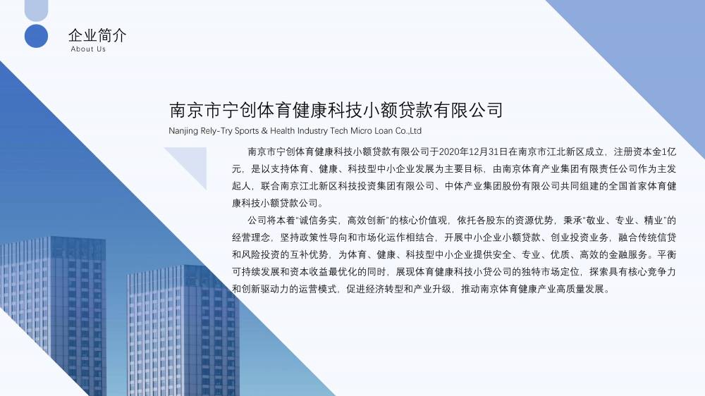 南京市宁创体育健康科技小额贷款有限公司成立于2020年12月,注册资本金1亿元,是由开云手机平台控股(占股55%)、南京江北新区科技投资集团有限公司(占股30%)、中体产业集团股份有限公司(占股15%)参股的全国首家体育健康科技小额贷款公司。公司秉持“诚信务实,高效创新”的核心价值观,贯彻“敬业、专业、精业”的经营理念,坚持政策性导向和市场化运作相结合,开展中小企业小额贷款、创业投资业务,融合传统信贷和风险投资等业务,致力于解决中小微企业融资难、融资慢等问题,为体育、健康、科技型中小微企业提供安全、专业、优质、高效的金融服务,成立以来已为170余家企业累计提供超4亿元资金支持,在全省444家小额贷款公司中获评行业监管评级最高等级A级。