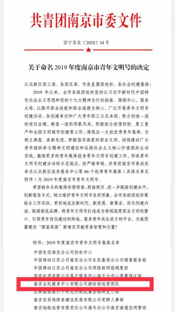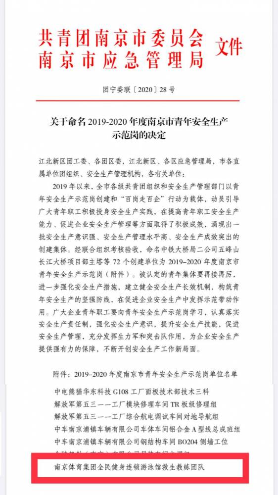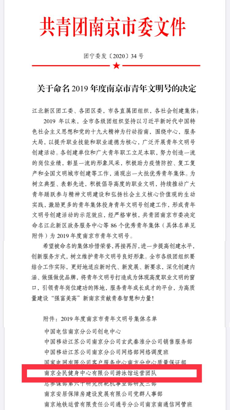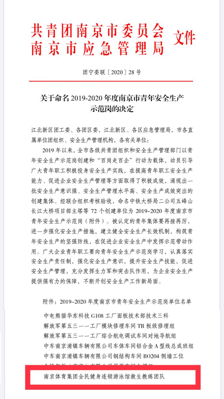 近日,共青团市委下发《关于命名2019年度南京市青年文明号的决定》(团宁委发〔2020〕34号),体育集团全民健身连锁游泳馆运营团队被评为“2019年度南京市青年文明号”称号;共青团市委与市应急管理局联合下发《关于命名2019-2020年度南京市青年安全生产示范岗的决定》(团宁委联〔2020〕28号),体育集团全民健身连锁游泳馆救生教练团队被评为“2019-2020 年度南京市青年安全生产示范岗”。