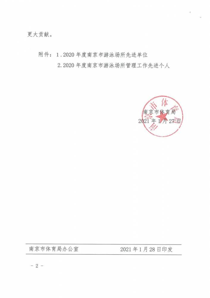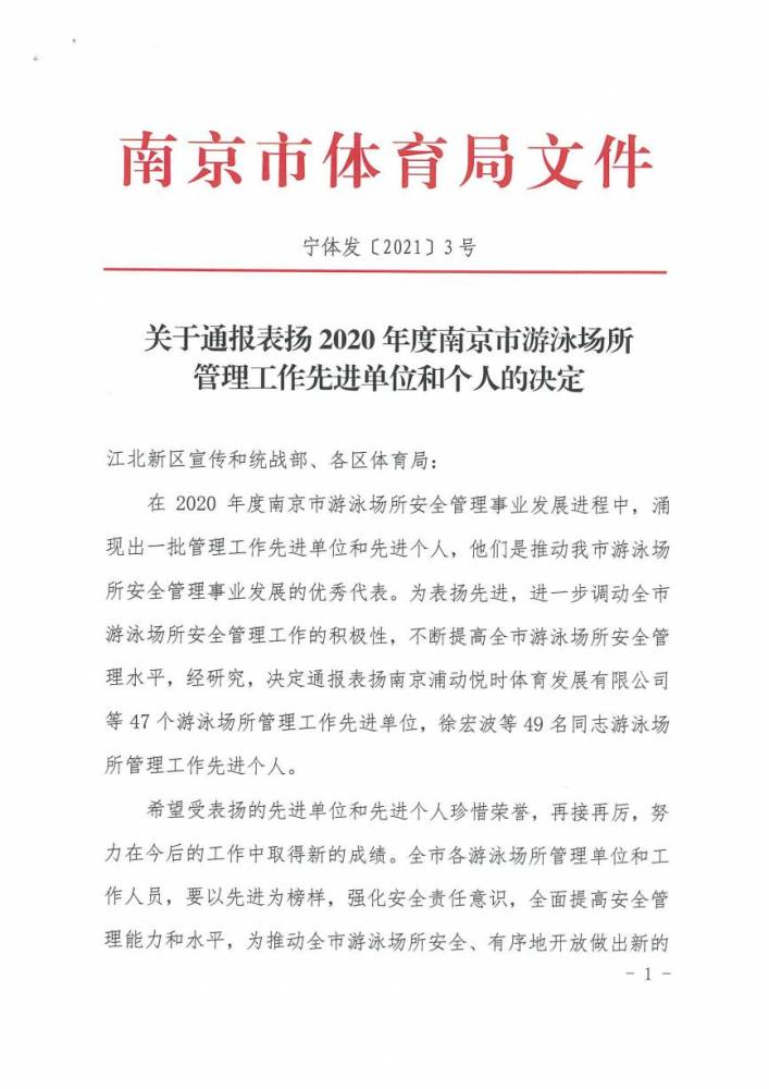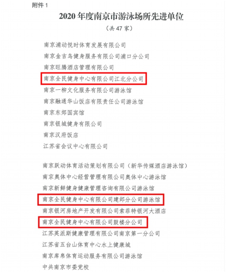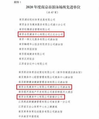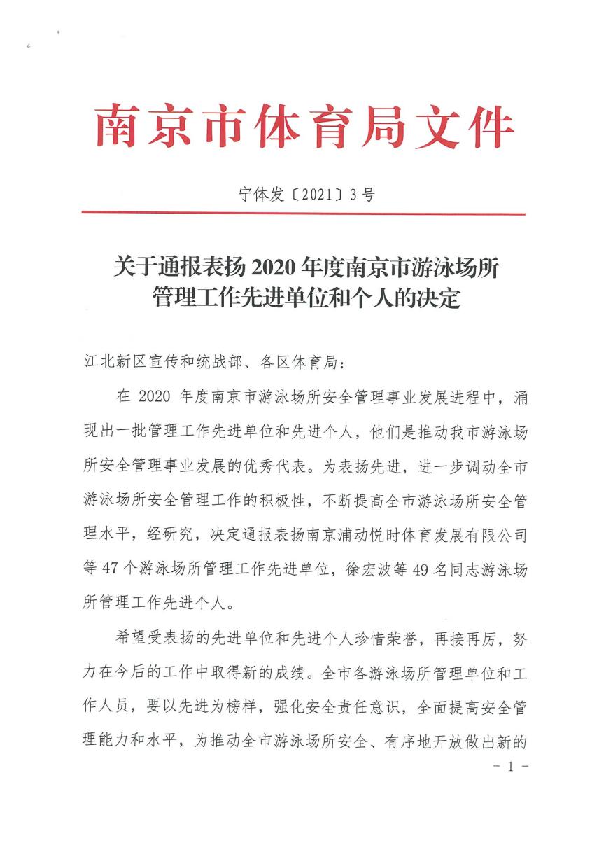 2021-03-5 3 436近日,南京市体育局下发《关于通报表扬2020年度南京市游泳场所管理工作先进单位和个人的决定》(宁体发〔2021〕3号),体育集团全民健身连锁所属三家场馆(南京全民健身中心有限公司江北分公司、建邺分公司、鼓楼分公司)获得“2020年度南京市游泳场所先进单位”称号,南京全民健身中心有限公司江北分公司刘高美同志荣获“2020年度南京市游泳场馆管理工作先进个人”称号。![]()
