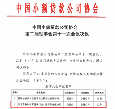 2021-05-8 4 0132021年4月23日,中国小额贷款公司协会吸纳南京市融创体育健康科技小额贷款有限公司成为协会会员。此次入会有助于加强同行先进经验交流,提高业务管理水平,优化风险防控机制,探索创新业务模式,把握行业政策导向,促进体育小贷业务合规健康发展。![]()