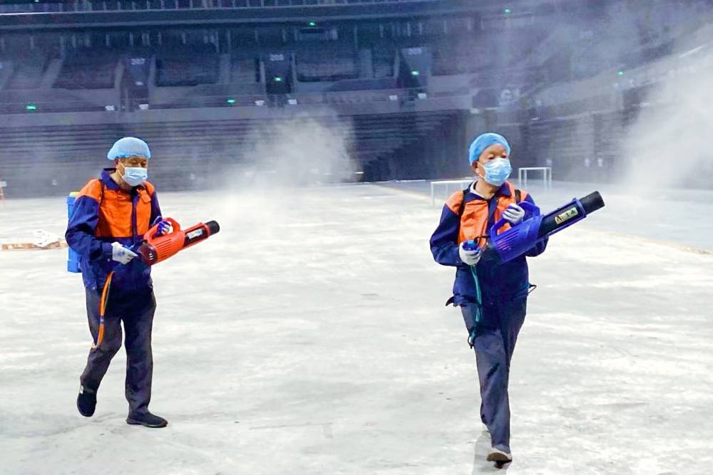 根据重点场所防疫消杀要求,青奥场馆邀请专业消杀团队对场馆进行消杀工作。8月25日,体育馆内白雾腾起,工作人员全副武装,背着几十斤重的消毒液,手握消毒喷头,对青奥体育馆内外各个角落进行全面消杀。在场馆物业服务中心的配合下,当天,除公共区域外,消杀团队还着重对体育馆内场、功能房、消防通道、电梯间、观众坐席、洗手间等重点防控区域进行严格消杀,坚决不留死角、不留盲区。