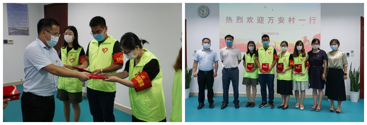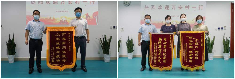 2021-09-1 2 6798月31日,江宁区湖熟街道万安村党委书记、村委会主任樊竹一行四人,为体育集团送来了抗疫锦旗,为参加抗疫的志愿者们送来志愿服务证书和感谢信。集团党委书记、董事长章小奇,集团党委副书记王虹燕,党群部及部分志愿者代表参加活动。![]()