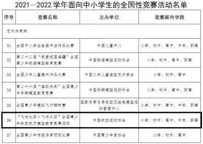 根据《教育部办公厅印发<关于面向中小学生的全国性竞赛活动管理办法(试行)>的通知》(教基厅〔2018〕9号)精神,由主办单位自主申报,经组织专家进行评审、公示和复核等程序,拟确定全国青少年人工智能创新挑战赛、“飞向北京飞向太空”青少年航空航天模型教育竞赛等37项竞赛为2021-2022学年面向中小学生开展的全国性竞赛活动。![]()