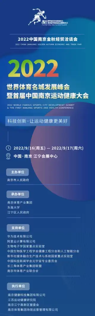 2022-09-2 2 499为进一步加快打造南京世界体育名城,提升南京奥运城市品牌形象,彰显长三角地区体育一体化高质量发展成果,为全国体育运动健康产业发展持续助力,由南京市人民政府主办,中国生物医学工程学会指导,南京体育产业集团与东南大学、江宁区人民政府联合承办的2022中国·南京金秋经贸洽谈会之世界体育名城发展峰会暨首届中国南京运动健康大会将于9月16日—9月17日在江苏省南京市江宁区会展中心举办。