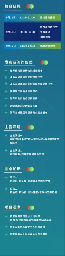 本届峰会定于9月16日(星期五)上午9:30正式开幕,活动精彩纷呈,体育科技展示、产业合作签约、院士主旨演讲、企业路演发布,以及运动健康产业如何谋篇布局,奥运城市品牌如何传承利用,体育产业发展如何精准发力等,现场的嘉宾大咖们将为您带来一场运动健康领域的饕餮盛宴。