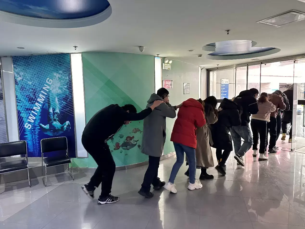 随后,在应急响应人员的带领下,职工们迅速掩住口鼻,弯腰从安全通道离开场馆,迅速撤离至安全地带。