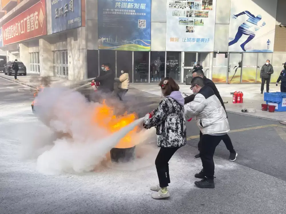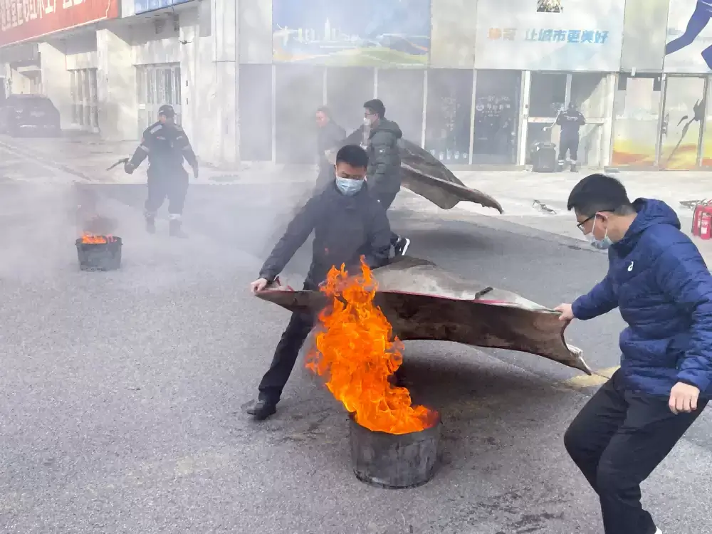 逃生结束后,教官对灭火毯、干粉灭火器等灭火器材使用方法进行详细讲解与说明,演示如何正确使用干粉灭火器,参演人员分批进行了灭火实操演练。