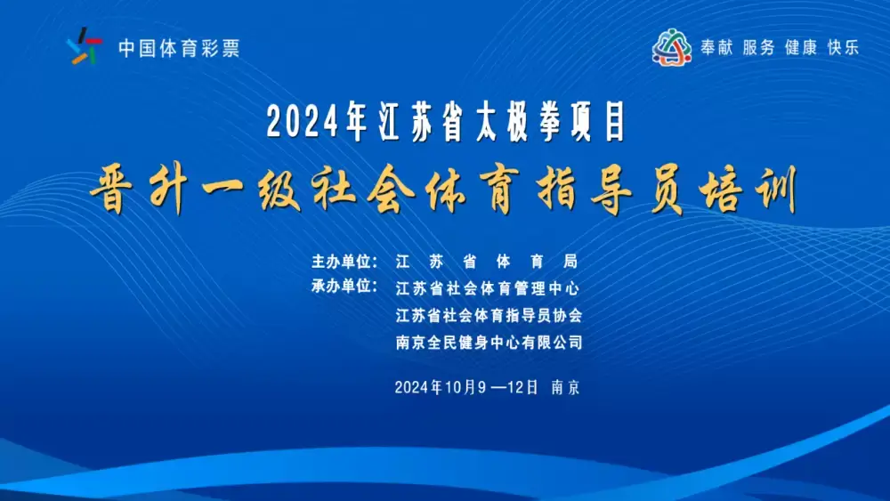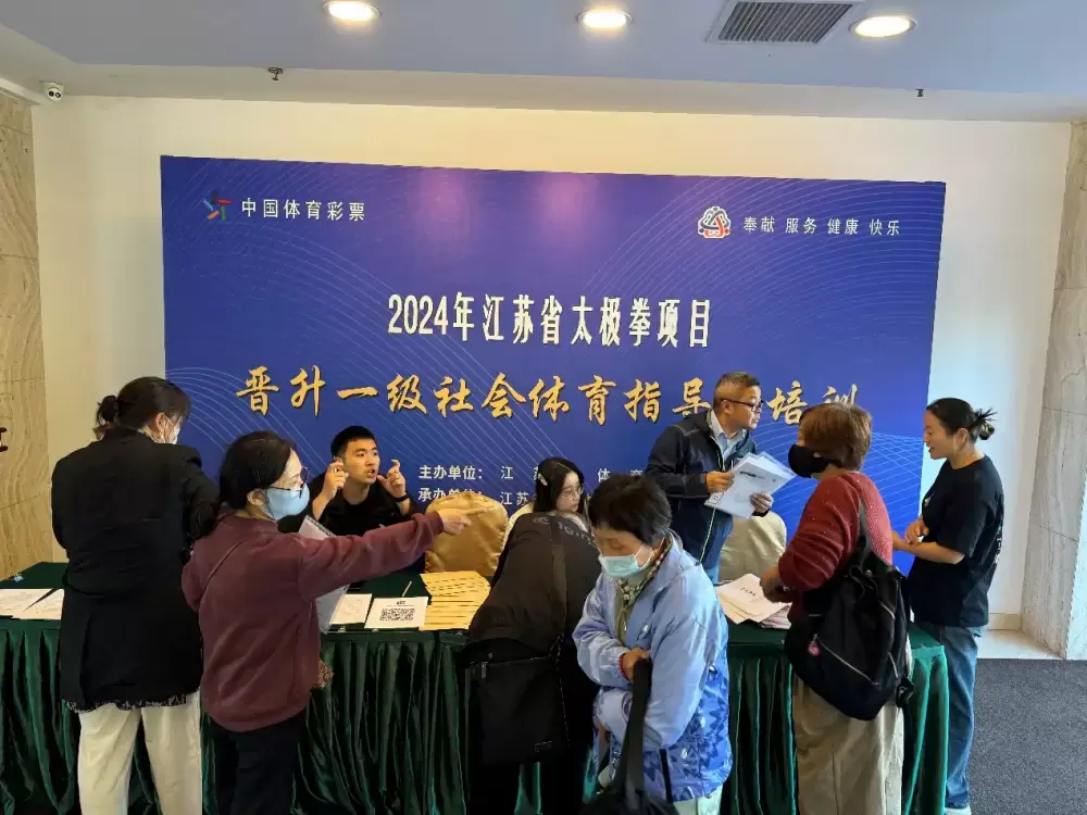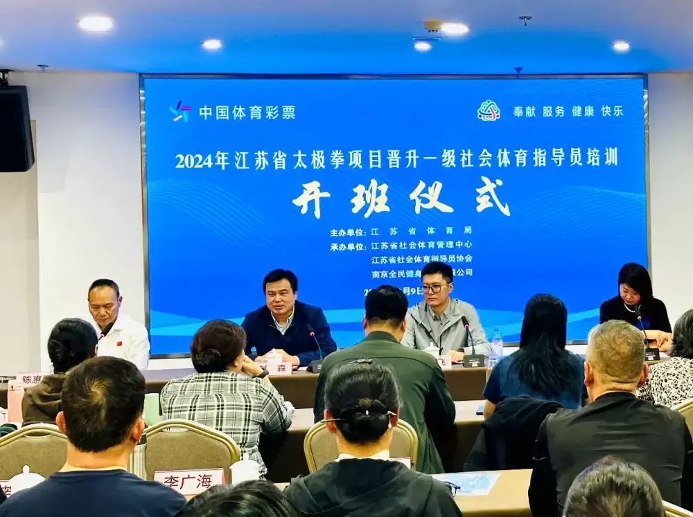 2024-10-14 2 44910月9日-12日,由江苏省体育局主办,江苏省社会体育管理中心、江苏省社会体育指导员协会、南京全民健身中心有限公司(以下简称“全民公司”)共同承办,中国体育彩票提供资助的2024年江苏省太极拳项目晋升一级社会体育指导员培训活动在南京举行。江苏省社会体育管理中心主任刘森、全民公司执行董事许晨飞出席开班仪式。