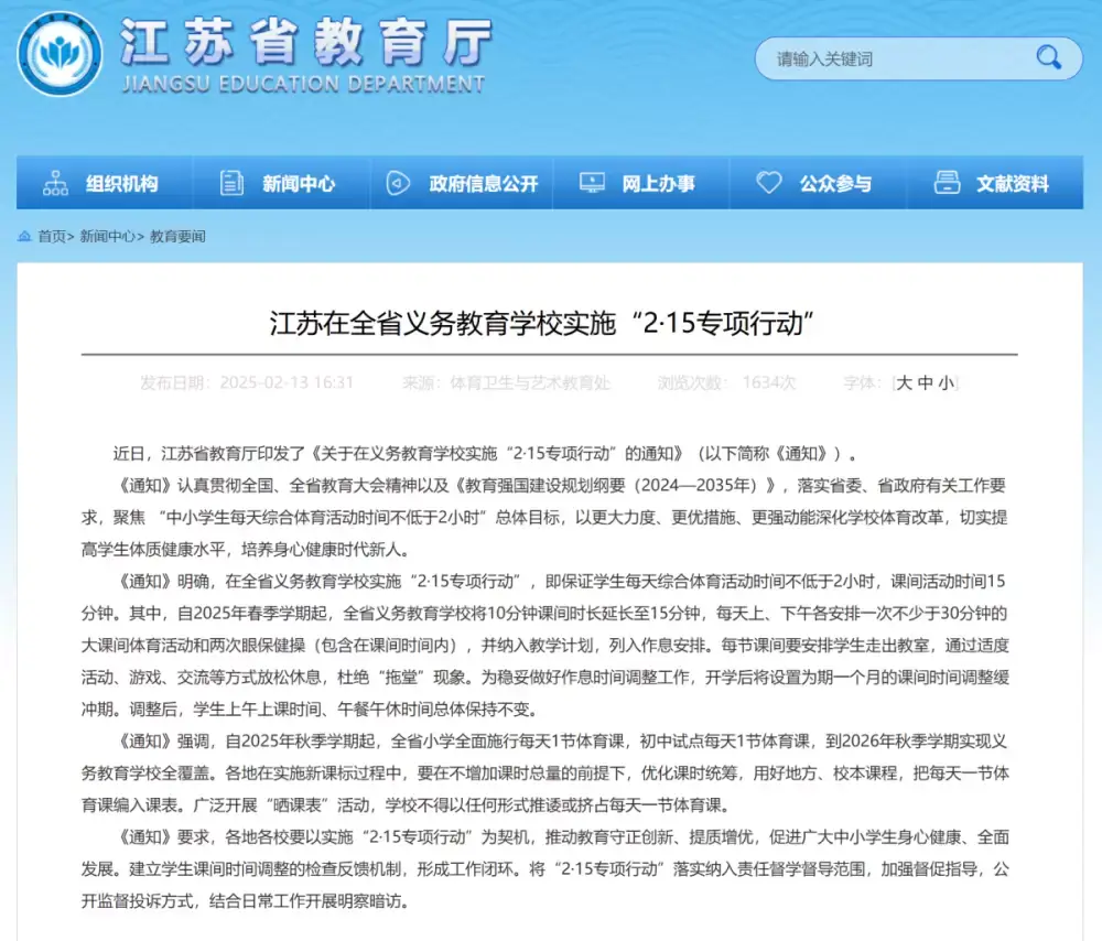 2025-02-19 2 777近日,江苏省教育厅印发《关于在义务教育学校实施“2·15专项行动”的通知》,明确提出自2025年春季学期起,全省义务教育学校将全面落实学生每天综合体育活动时间不低于2小时,并确保15分钟课间时长。这一政策的出台,标志着江苏省在推动青少年体质健康、促进全面发展方面迈出了重要一步。