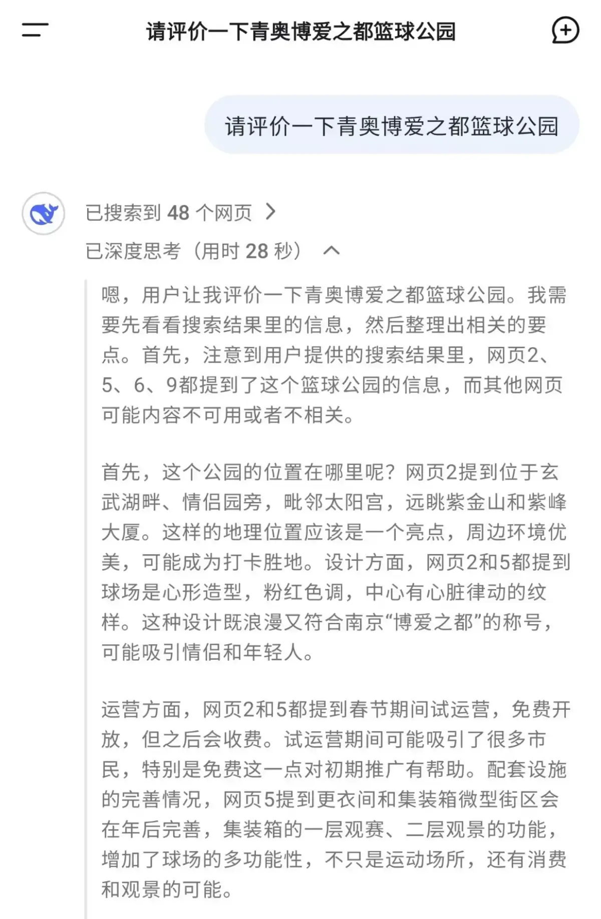 2025-02-19 2 155青奥·博爱之都篮球公园自春节期间投入试运营以来,已经逐渐被市民熟知。当我们让DEEPSEEK评价一下“青奥·博爱之都篮球公园”时,它搜索了48个网页,深度思考28秒后给出了如下评价: