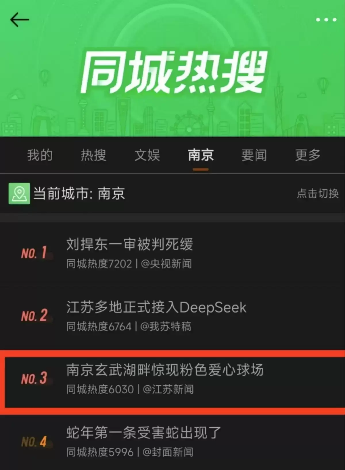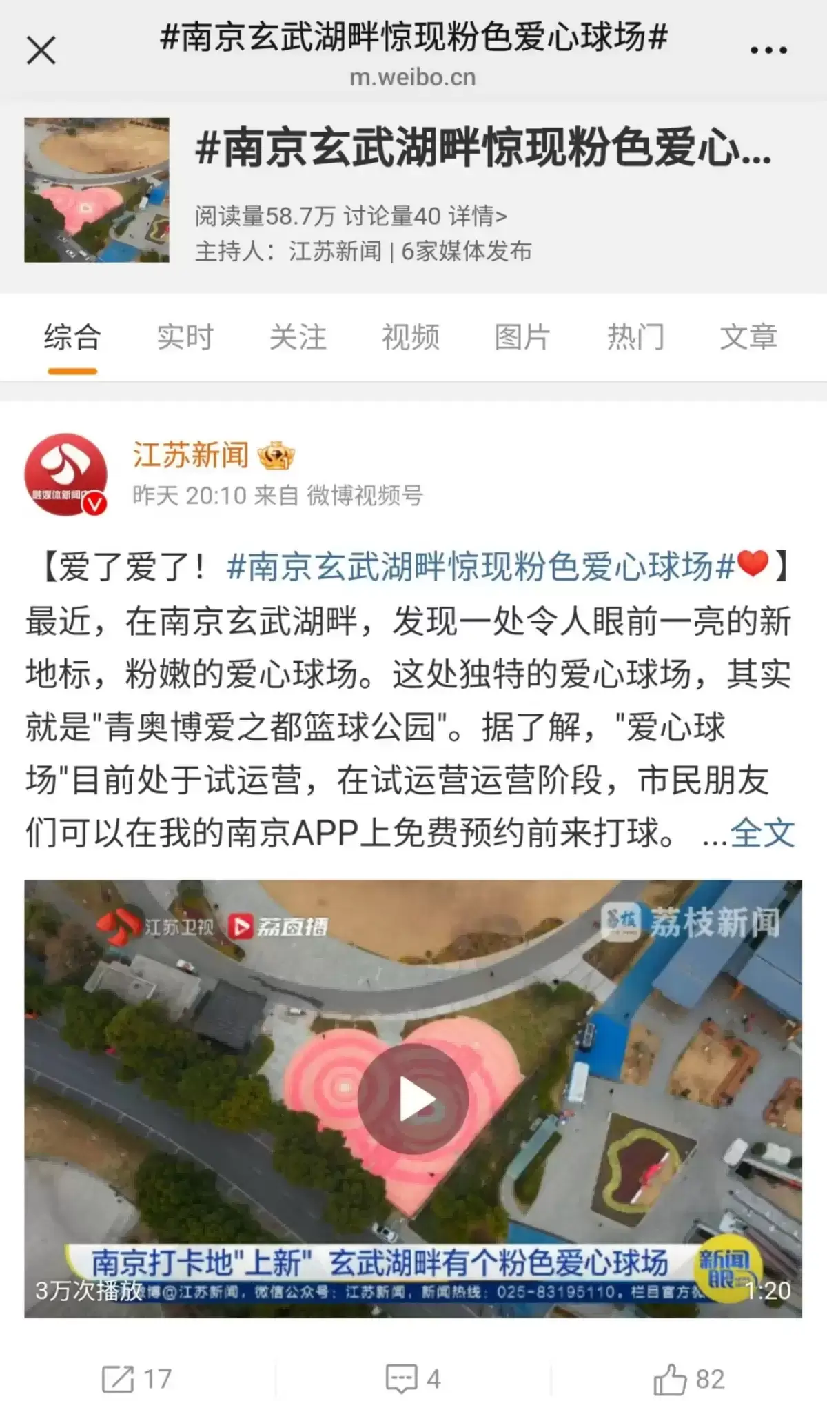 玄武湖畔惊现爱心球场!更是冲上了新浪微博“同城热搜”第3名。