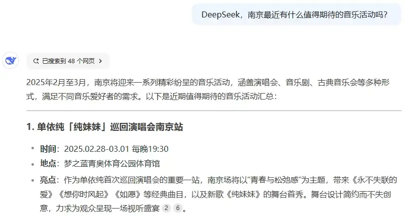 “DeepSeek,南京最近有什么值得期待的音乐活动吗?”DeepSeek秒答:“2月28日-3月1日,单依纯「纯妹妹」巡回演唱会南京站”