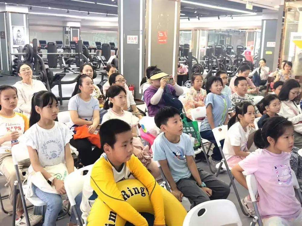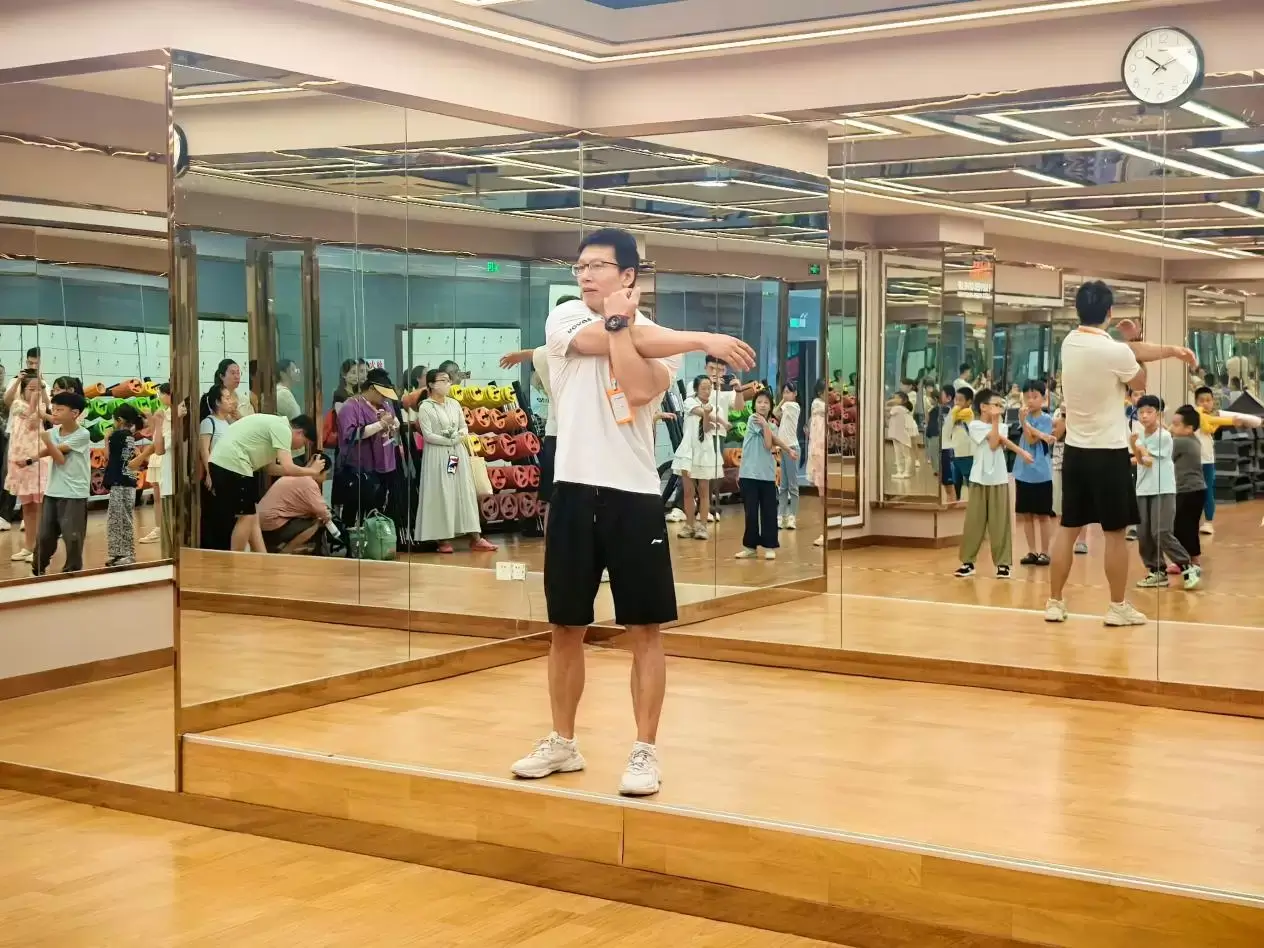 经过约40分钟的理论讲解后,专业健身教练潘舜玺带领孩子们走到场馆中央,开启体适能热身环节。“双手交叉触脚尖,膝盖不要弯!”“弓步压腿时,后腿伸直,重心往下沉!”随着潘教练的口令,孩子们跟着节奏伸展四肢、活动关节。“暑期游泳前热身特别重要,能有效避免突发抽筋的风险,很多人嫌麻烦直接下水,结果腿抽筋就慌了神,今天的热身就是教大家能够学会保护自己。”