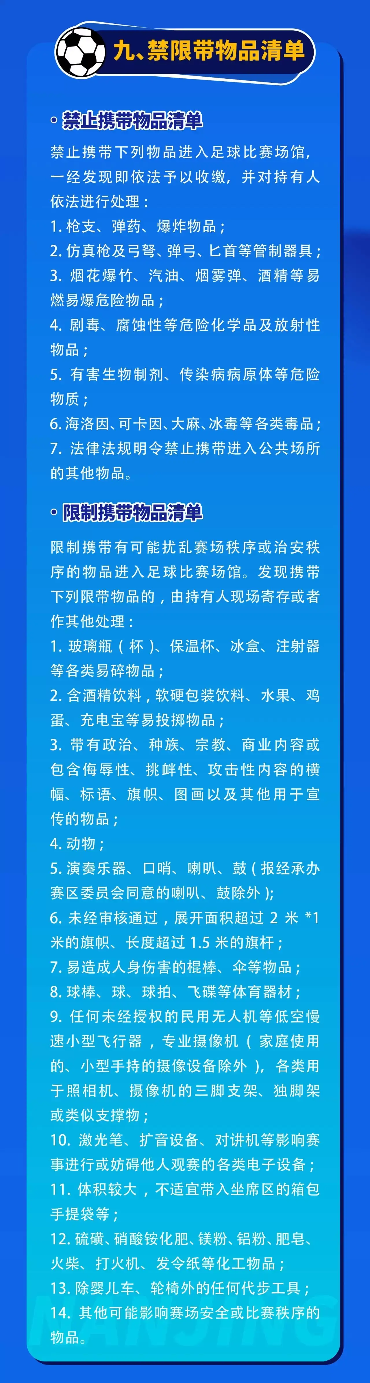 - 场内禁止吸烟、禁止踩踏座椅、禁止投掷物品、禁止翻越隔离设施。