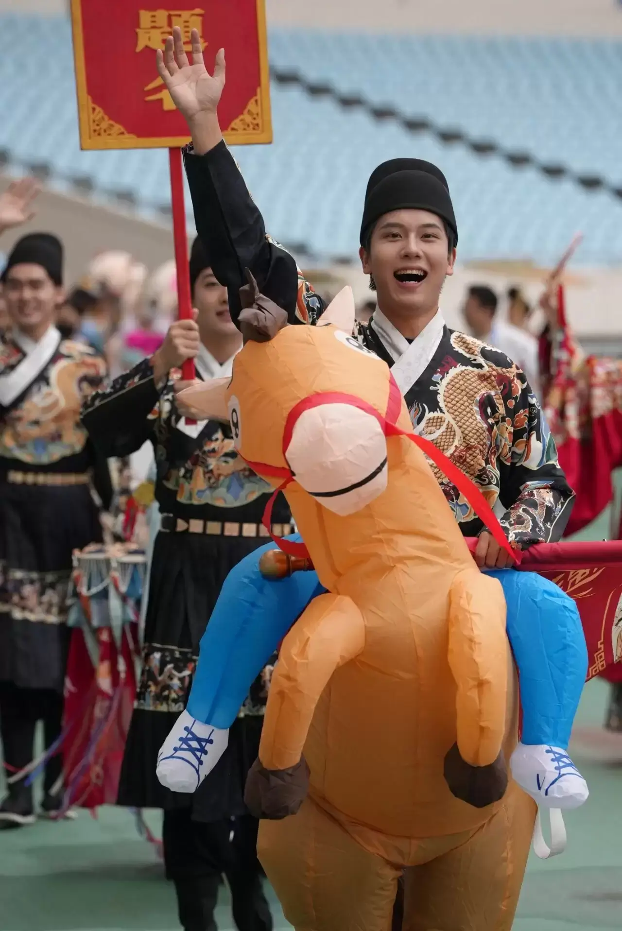 秦淮河方阵的成员身着明制状元袍与婚服,一人骑着黄马站在队伍前列。“状元巡游” 的阵仗瞬间把观众拉进“十里秦淮河畔,千年文脉流转”的意境里——“金陵子弟冠华夏”的文教传统,此刻成了给南京队的“底气加持”。