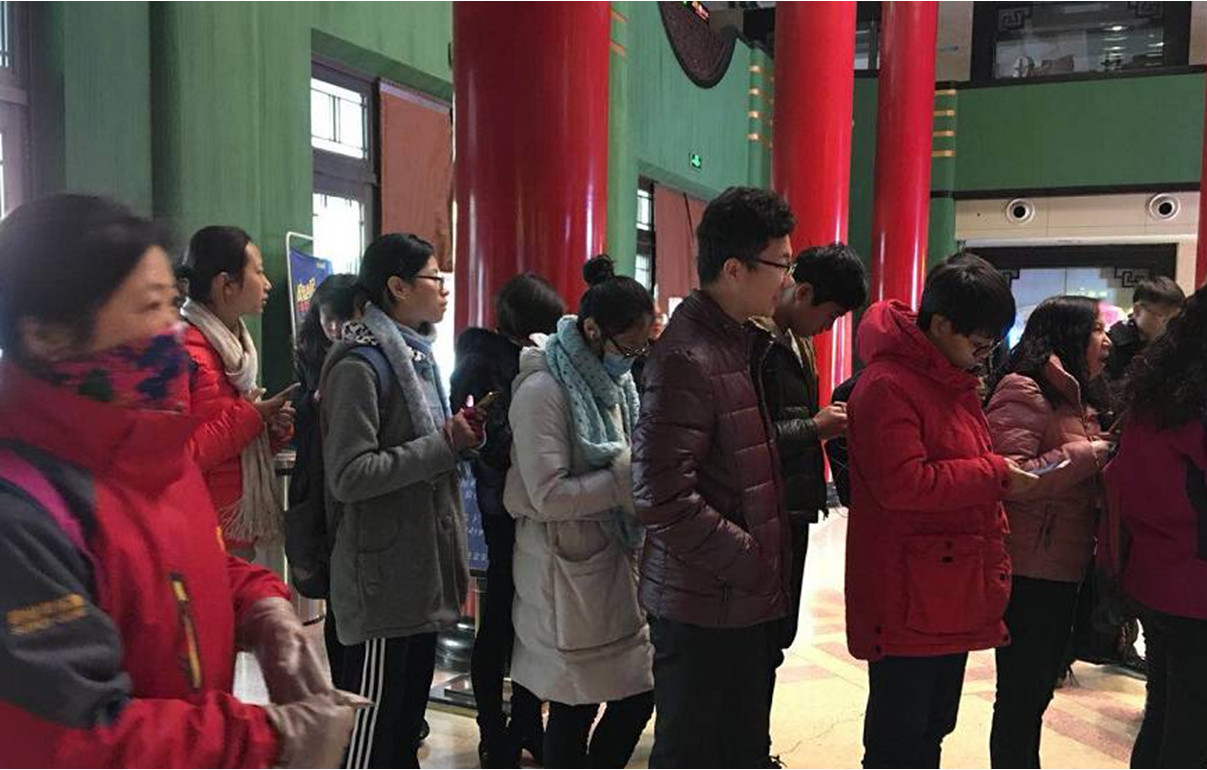 观影当天寒风凛冽,即便这样也阻挡不了大家的热情,这是青奥志愿者的第一次回馈活动,百名中奖的志愿者伙伴踊跃参加,九点半左右,大家就陆陆续续来到了大华大戏院,进行有序排队签到。
