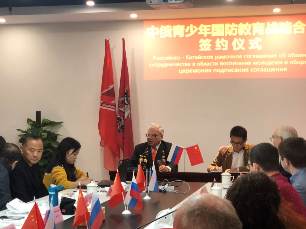 签约仪式前双方进行了友好亲切的会谈,双方代表肯定了此次签约的重要意义,拉里萨会长表示,两国是山水相依的亲密伙伴,两国人民的友好交流渊源流长。近年来,在两国领导人的精心培育和推动下,中俄全面战略协作伙伴关系不断取得新的进展,并给两国和两国人民带来了巨大福祉。中俄两国青少年国防教育交流与合作框架协议是在友好平等的国家关系基础上签订的,是时代背景下的优秀产物。