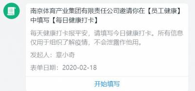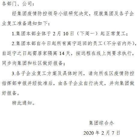 在节日期间,集团利用钉钉、微信等网络平台向员工分享网上学习素材,了解员工出行、健康情况,督促员工开展每日健康打卡,叮嘱员工强身健体。上班第一天,集团党委致全体员工一封特别的信——绝杀疫情 共克时艰,告知员工2020年要学会更加爱自己,在疫情防控期间要增强防控意识和自我保护能力,并时刻保持思考,做好“应做之事”,尽好“应尽之责”。集团本部要求每位外地返宁的员工,按规定居家隔离14天后再进入集中办公区域办公;鼓励下属子公司施行居家办公,利用线上交流第一时间获取员工思想动态和健康信息,了解员工需求和困难,凝聚全员智慧,创意复工计划,避免因业务停滞而给员工带来的恐慌。