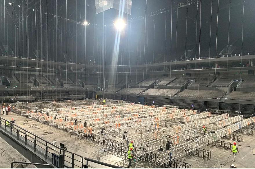 作为南京市级文体中心,南京青奥体育公园的软硬件条件都到达了国际化标准,能够轻而易举满足各类高要求项目。本次“天猫618超级晚”项目从5月下旬进场搭建至6月中旬撤场,历时24天,不仅创下青奥体育馆内演出类活动的最长周期,还创下场馆顶部悬吊重量、舞台屏幕面积、总用电量等多重纪录。