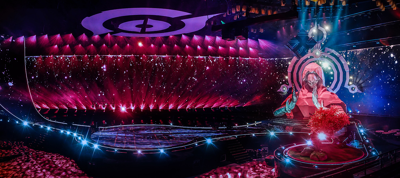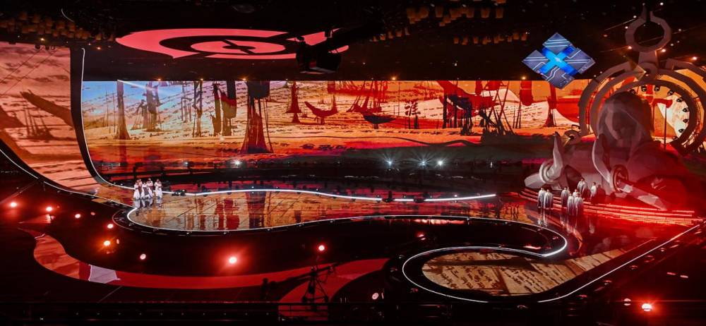 根据舞台设计要求,本次活动舞台涉及区域面积规模较大,需场馆配合与保障的项目较为精细与严格。为最大限度“让位”于舞台,场馆根据舞台规模提前部署场地方案,并将内场四面伸缩座椅进行调整,最终顺利让近4000平米的活动舞台得以呈现,这也创下青奥舞台面积之最的纪录。除了舞台规模外,本次活动最大的亮点当属现场各式酷炫屏体。据了解,现场屏幕分为主屏、地砖屏、升降屏、瀑布屏等,这些屏体通过与不同灯光物美的组合,打造出精美绝伦的沉浸式舞台。其中,舞台主背景采用巨幅LED屏幕,通过270度环绕的方式将整个舞台包裹串联起来,在宏大设置的庆典场景中,凸显出舞台表达的中心,将整个场馆与舞台交融在一起,搭配灯光、音响等技术,不仅为表演者营造出更为梦幻的表演氛围,也更深刻地将王者荣耀这一IP融入表演,为观众提供身临其境的沉浸式观看体验。