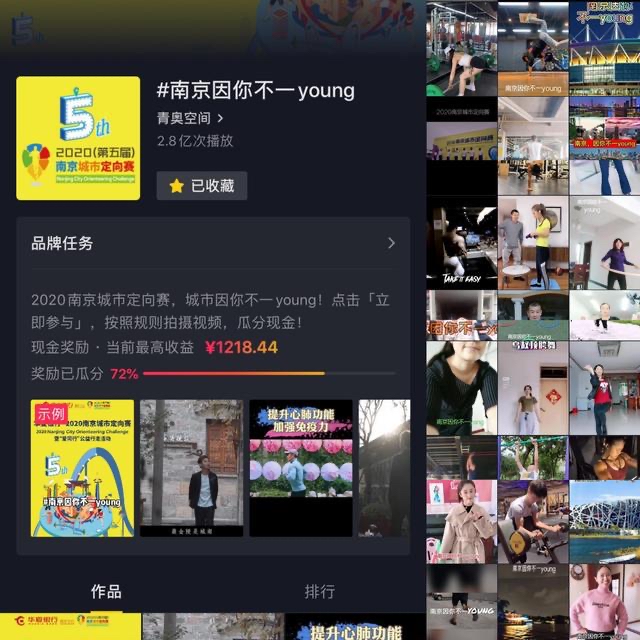 运动是生命最好的状态,是我们挥洒汗水时愉悦的奔跑,是每个人保持青春活力的秘诀。今年是南京城市定向赛五周年,时间带给我们这座城市和每一个人太多的改变,疫情之下,全民健身显得尤为重要,基于此,组委会联合华夏银行南京分行于10月23日-31日在抖音平台发起了"南京因你不一young"线上挑战赛,吸引了数万人参加,线上累计播放已达2亿余次,从孩子到老人,从跳绳到搏击,各类全民健身类视频丰富多彩,层出不穷。为贯彻落实全民健身国家战略,推进健康南京建设,根据国务院《全民健条例》、《全民健身计划(2016-2020年)》和省政府《江苏省全民健身实施计划(2016-2020年)》的要求,南京市提出"至2020年,建成优质均衡、特色鲜明的公共体育服务体系和多样化、多层次体育产品与服务市场供给体系,人民群众身体素质显著增强、健康水平显著提升,全民健身成为'健康南京'的靓丽名片。"五年来,南京城市定向赛不负众望,成为南京全民健身运动的一项标志性体育赛事,得到了社会的广泛认可和广大市民的欢迎。 在六朝古都,赏六方美景,南京城市定向赛早在第一届就提出用脚步丈量城市,打卡全城地标,五年来,越来越多的新地标不断加入,串联起的是参赛者对于这个城市的全新认识体验。参加定向赛除了考验团队协作,能增进朋友之间感情之外,对于熟悉的城市,也是一次难得的"亲密接触"。"因为任务要求,会前往很多自己没去过的地方,发现这个城市里更多的美好。" 坐落于燕子矶板块,定位城市综合运营商的宝能金融中心,就是从今年才开始建设并逐步投入运营,相信未来一定能成为燕子矶的地标之一。