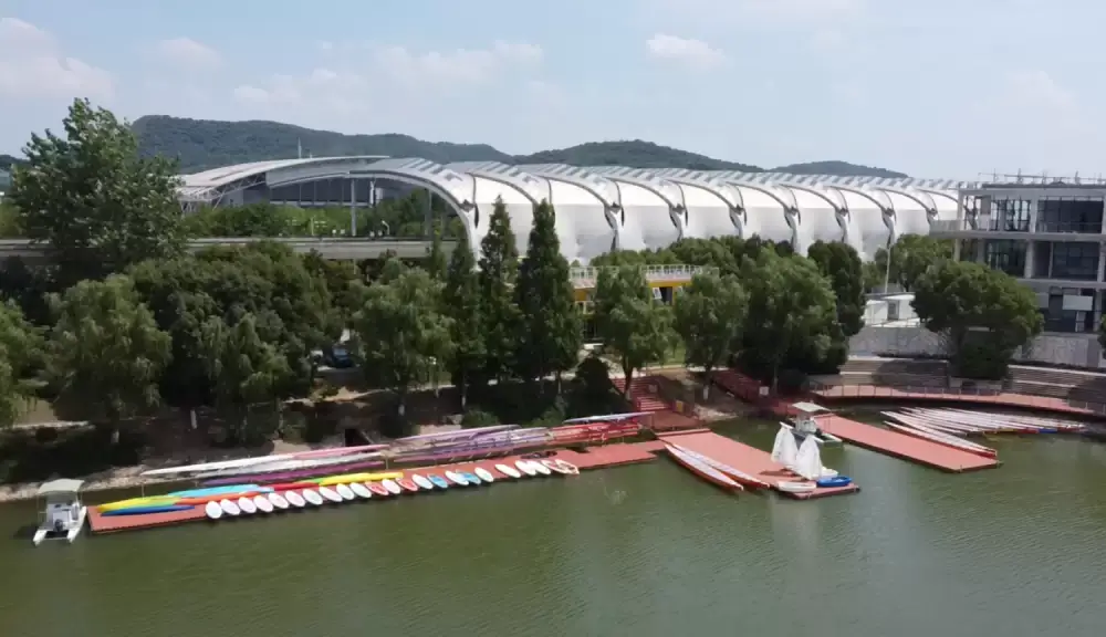 青奥水上运动中心·羊山湖基地系南京体育产业集团第2座青奥水上运动中心,湖面位于南京仙林大学城东部,形状狭长,东西长约1千米,南北宽约0.3-0.4千米,周边自然生态环境优良,人文书香氛围浓郁,湖水清澈,非常适合进行水上运动项目。赛时,水域场地可最多设置6条航道,具备全国性赛艇赛事举办条件。南京健康科技集团充分利用羊山湖优质的自然资源,配备国家健将运动员,将其打造成集赛艇、浆板、龙舟、皮划艇、帆船等项目的水上运动项目基地,满足大众享有绿色、安全、方便的水上运动产品和休闲服务的需求,推广普及水上运动又能组织承办竞技体育。项目建成后有效增加水上运动场地37万平方米,陆上运动场地300平方米,打造水上体育消费新场景,推动区域内体育消费升级。